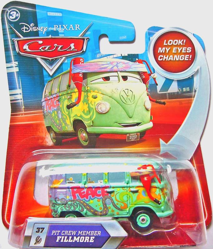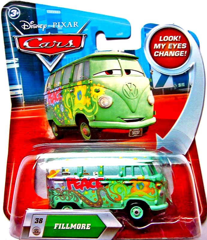 Fillmore is a 1960s Volkswagen Type 2 microbus character from the Disney Pixar Cars film series. As the organic fuel advocate and resident hippie van of Radiator Springs, Fillmore has appeared in multiple Pixar Cars films and shorts since 2006. The full Fillmore die-cast lineup from Mattel spans 20+ years and 45 confirmed variants.
