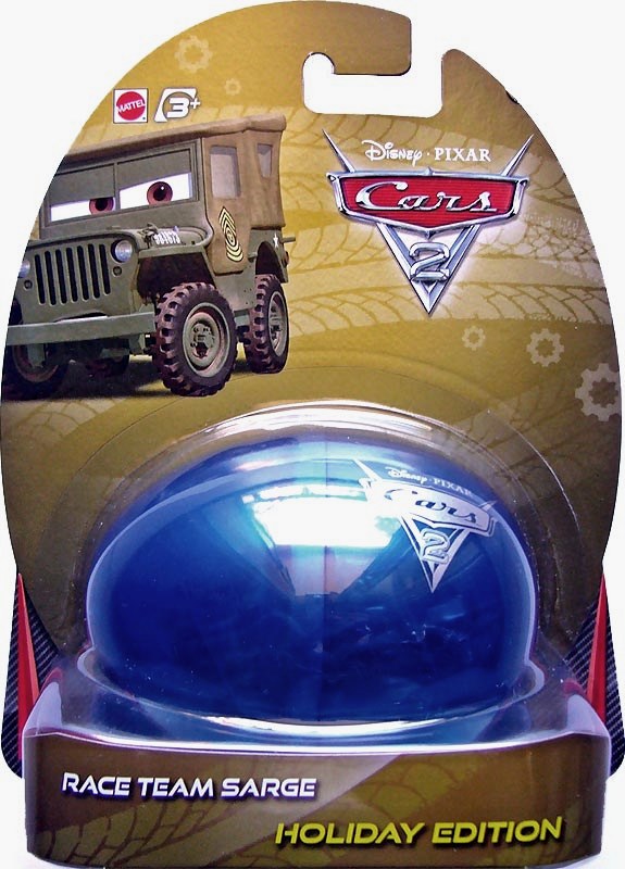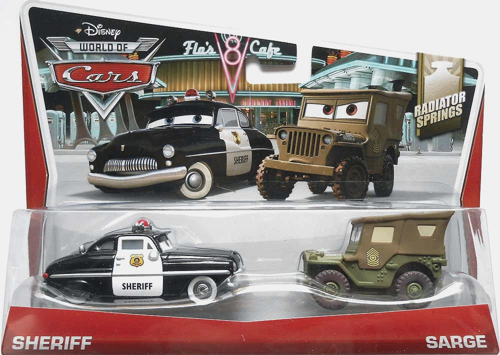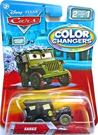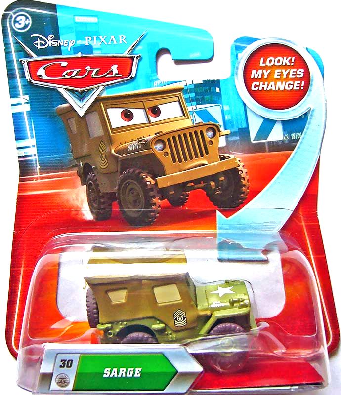 Sarge is the army veteran and surplus shop owner of Radiator Springs in the Disney Pixar Cars film franchise, voiced by Paul Dooley. The character is a 1942 Willys Army Jeep, first appearing in the 2006 Pixar Cars movie. Mattel has released Sarge as a die-cast collectible across multiple film eras and product lines since 2006.